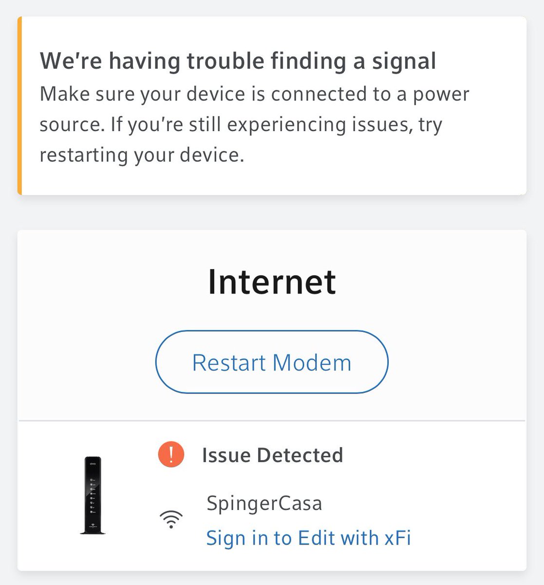 Restarting Your Gateway via the Xfinity My Account App. If you have access to the internet from another source like a mobile phone visit the Comcast website to verify there are no outages in your area. I initially figured we needed a new router.